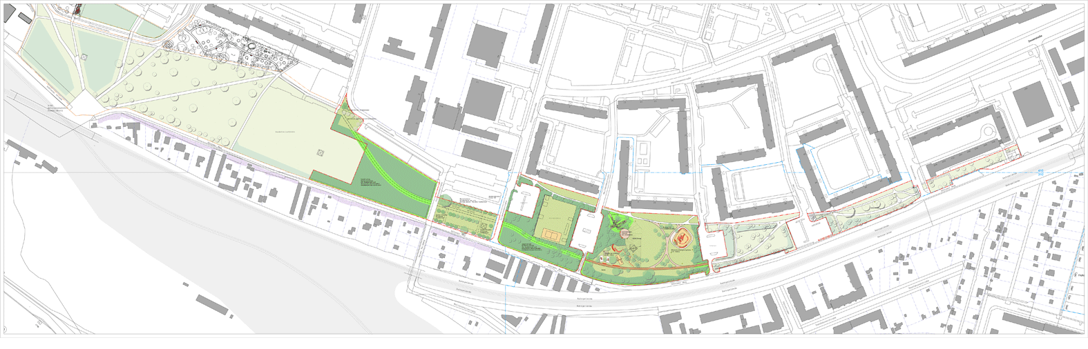 Ausbau und Optimierung der Wegeverbindungen ist Hauptbestandteil der Planung. Die Grünverbindung soll zukünftig sowohl für den täglichen Bedarf (schnelle Wegeanbindung nach Hause), als auch für die Freizeitnutzung (Flanieren, Erholungsspaziergang) nutzbar sein. Dabei ermöglichen Asphaltwege eine barrierefreie Nutzung und Aufenthaltsbereiche mit zeitgemäßen hellgrünen Bänken schaffen Erholungsorte.